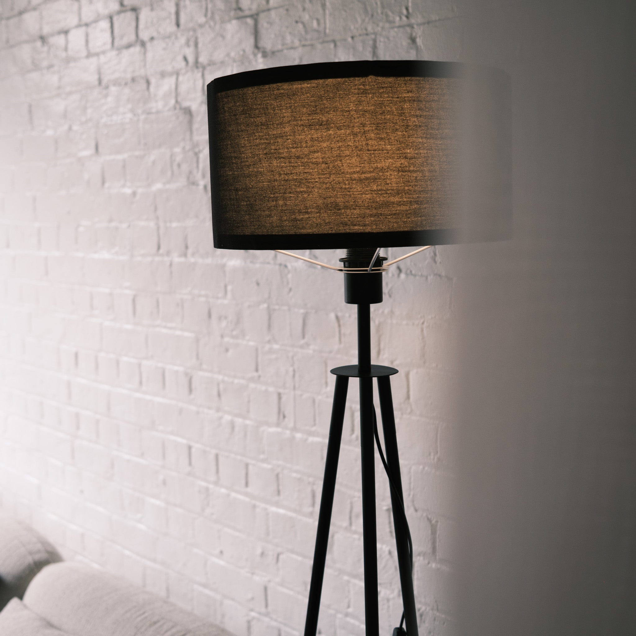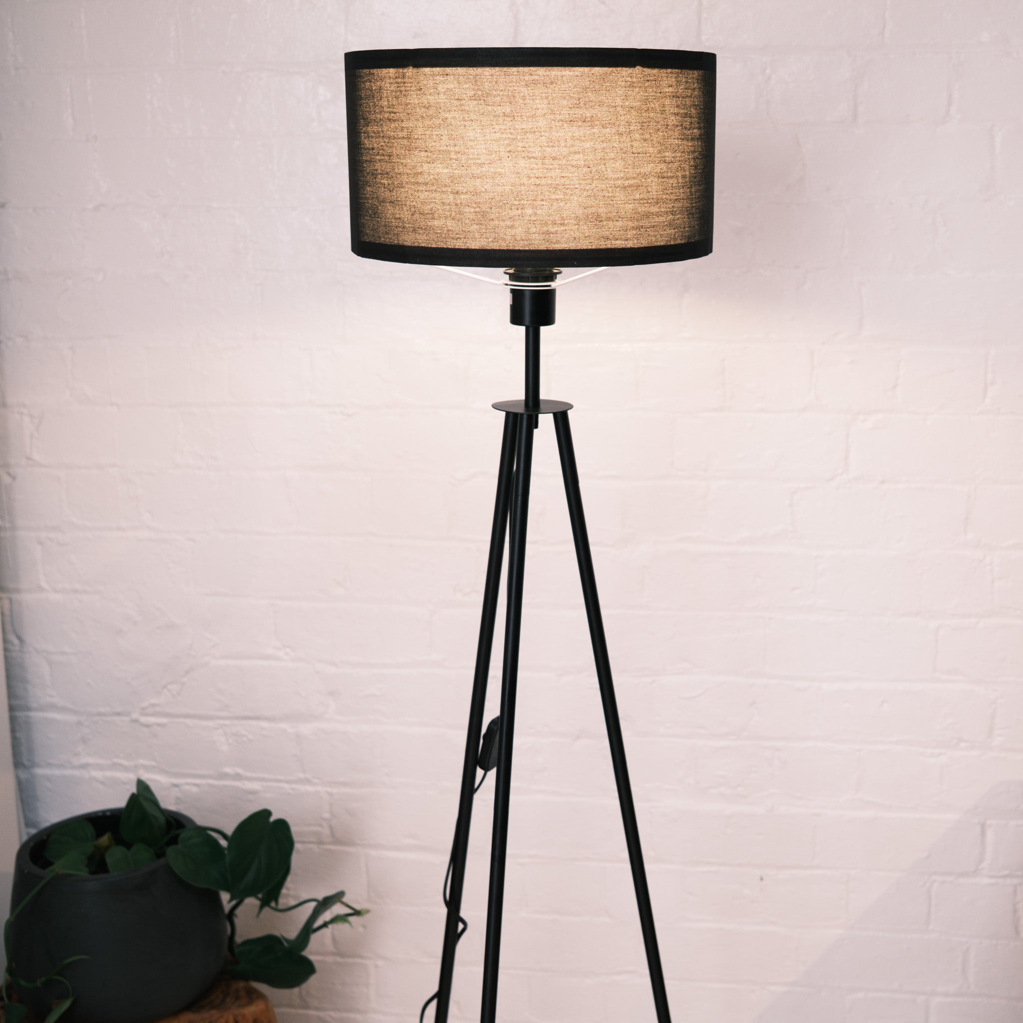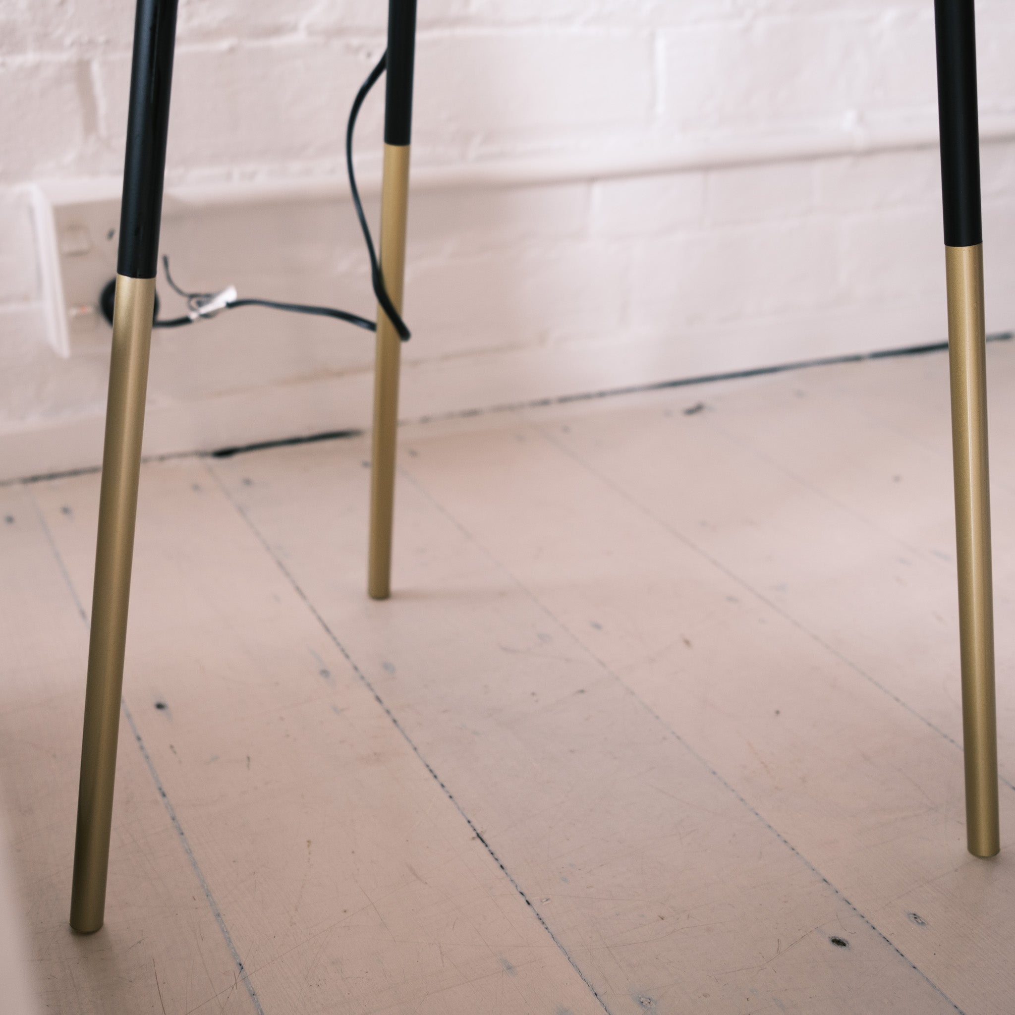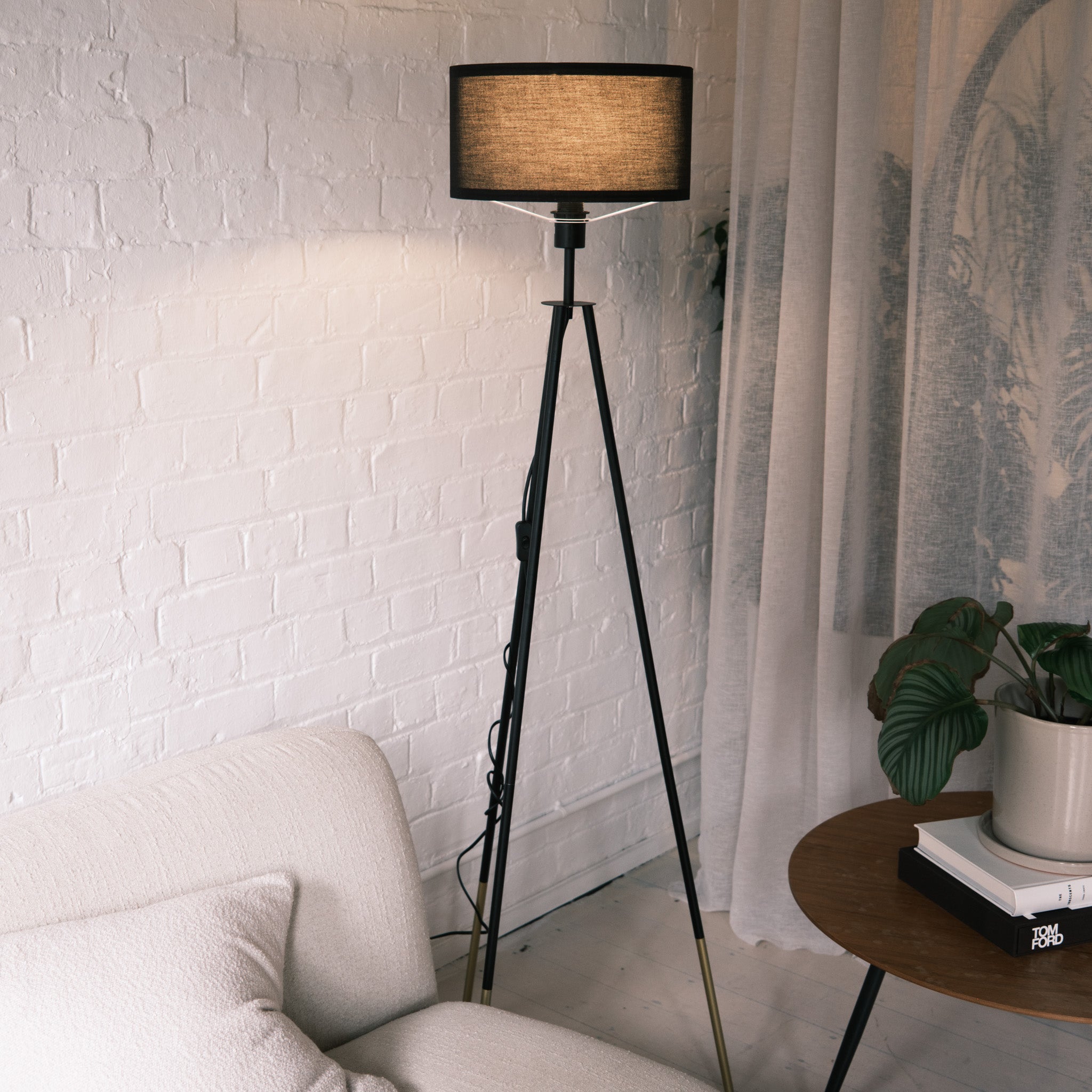 Structured Silhouette The Vanta brings a distinct geometric element to a room. Its matte black metal tripod legs taper down to dipped brass-finish tips, adding a refined flash of gold that prevents the design from feeling too heavy or stark.