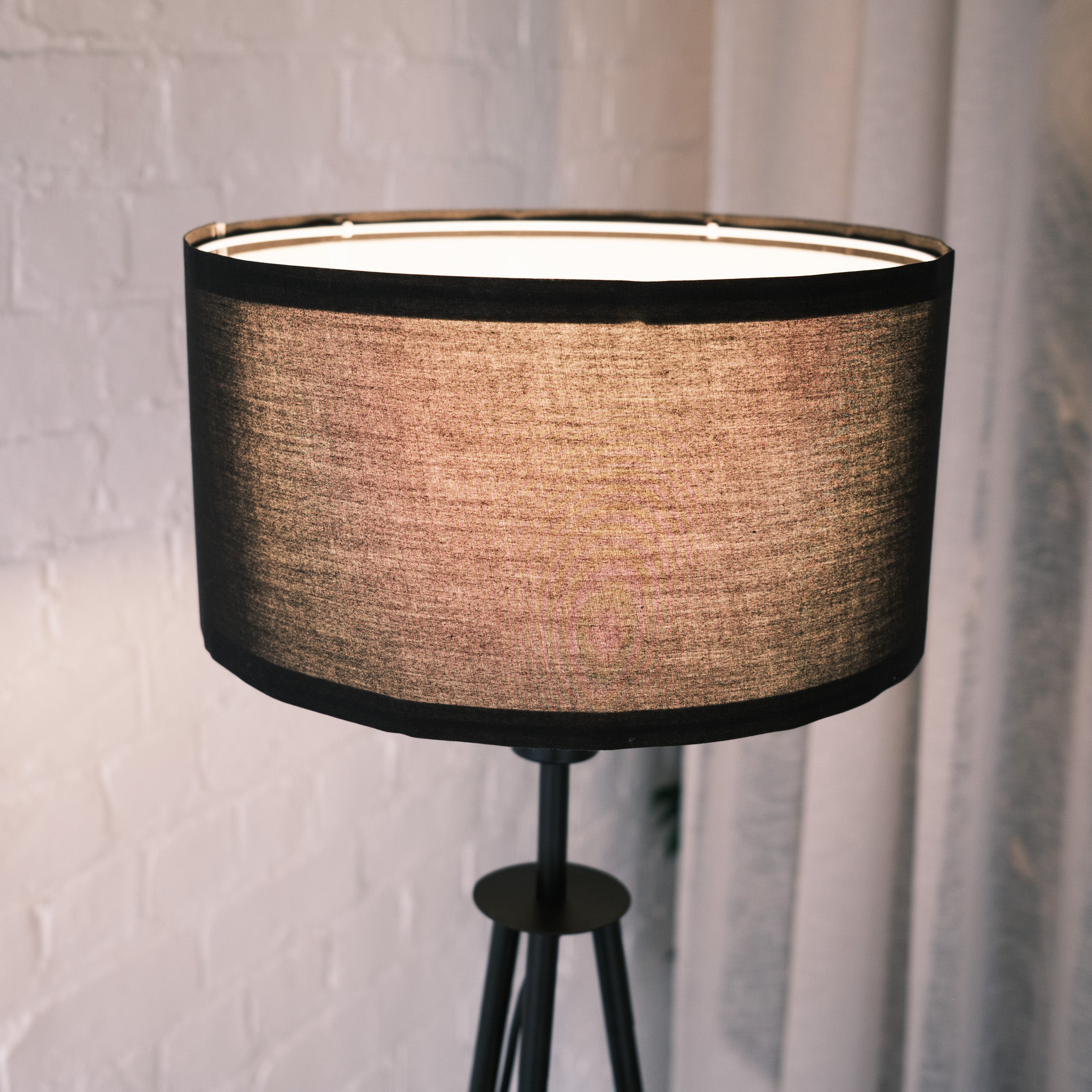 • Textured black fabric drum shade for moody lighting